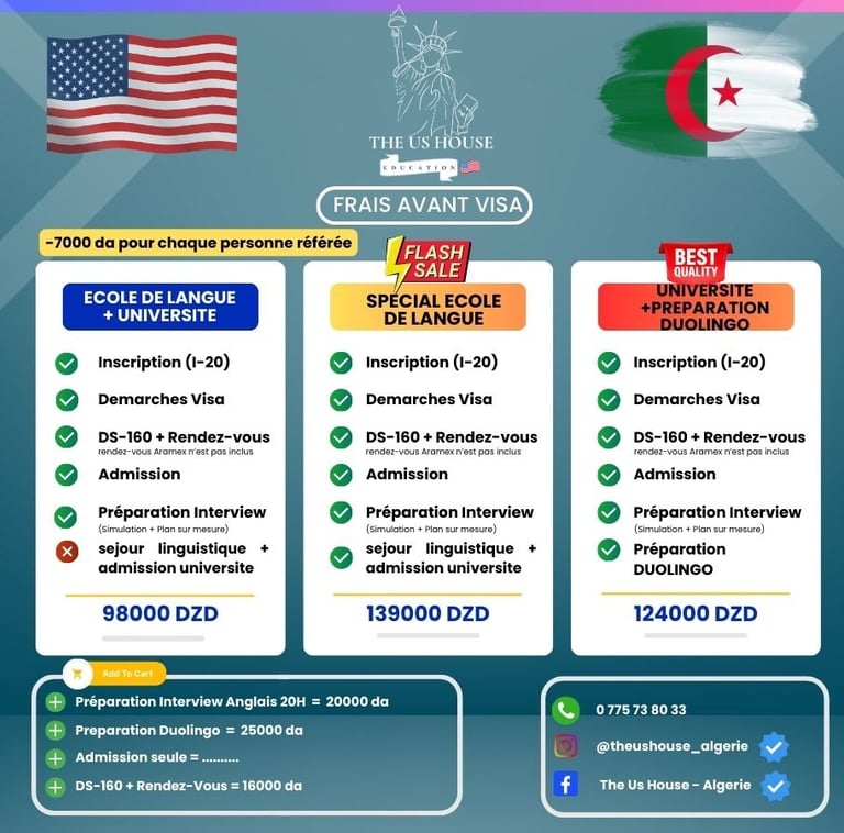 Ces forfaits ont été soigneusement étudiés par les membres de la US House pour vous offrir les meilleurs services au meilleur prix en Algérie, pour toutes vos démarches de visa F1 et de conseils pour les études aux États-Unis. Veuillez noter que les frais de rendez-vous de 25 900 DA ne sont pas inclus dans nos offres.